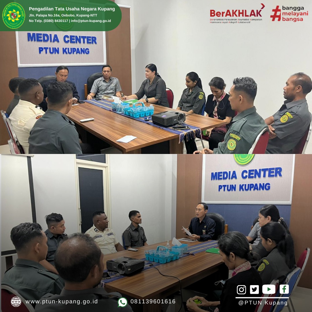 Ketua Pengadilan Tata Usaha Negara Kupang, Bapak I Gede Eka Putra Suartana, S.H., M.H., dan Wakil Ketua Pengadilan Tata Usaha Negara Kupang Bapak Ardoyo Wardhana, S.H., M.H. serta para pejabat struktural melaksanakan Rapat Internal yang bertempat di Ruang Media Center Pengadilan Tata Usaha Negara Kupang dan dilanjutkan dengan rapat bersama PPNPN Pengadilan Tata Usaha Negara Kupang